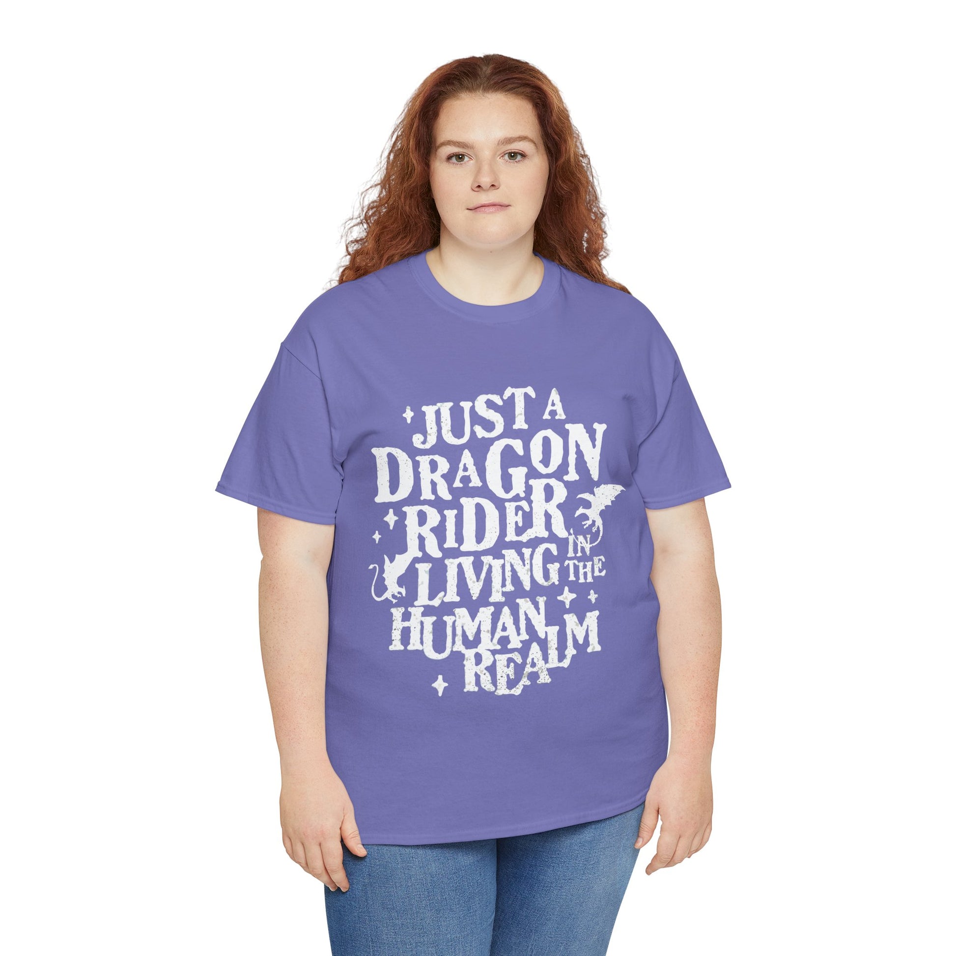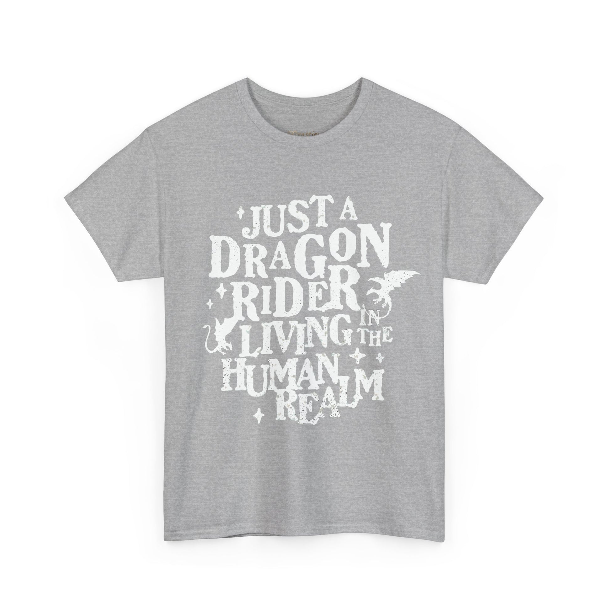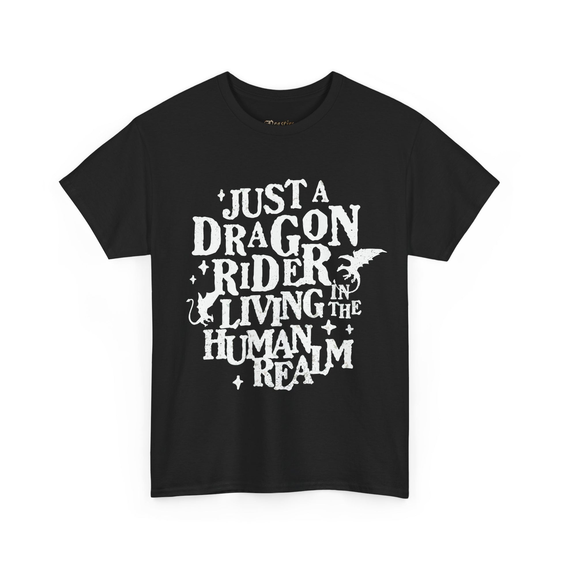 A soft, timeless tee that speaks to anyone who prefers dragon flights over rush-hour traffic. The bold, hand-drawn lettering reads “Just a Dragon Rider Living in the Human Realm,” surrounded by tiny stars and a small dragon silhouette — a subtle badge for fantasy lovers who live between pages and day-to-day life. Worn alone or layered under a jacket, this shirt adds a whisper of magic to everyday routines, whether you’re heading to a convention, a casual meetup, or curling up with a favorite fantasy novel. The medium-weight cotton holds prints crisply and wears in comfortably, so the design stays vibrant through many adventures.