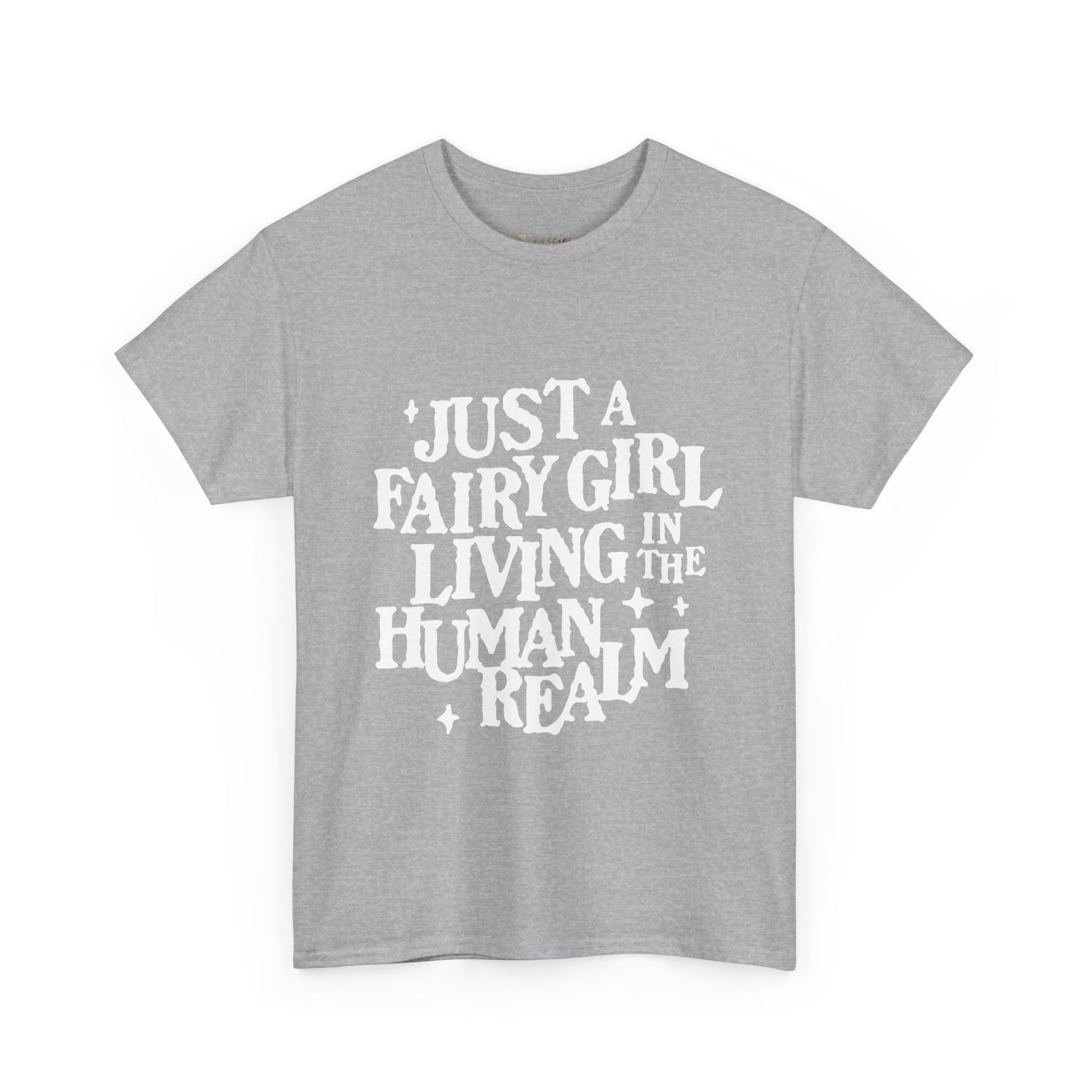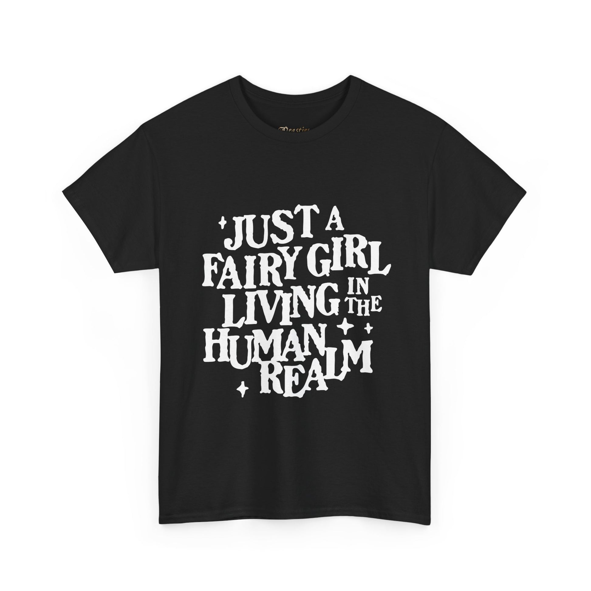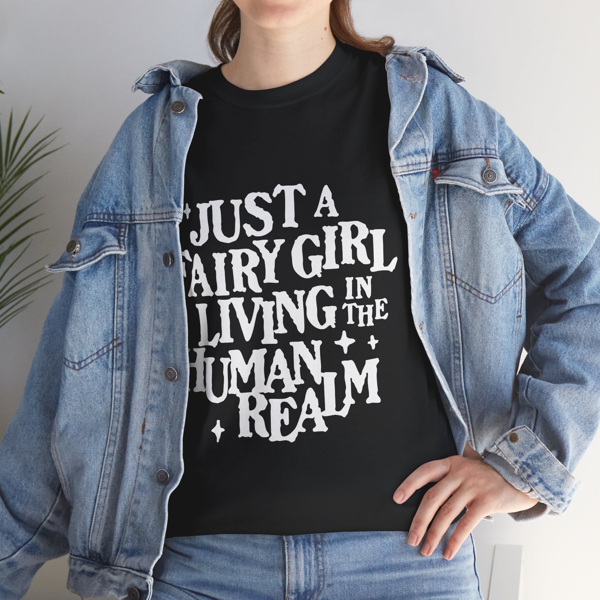 Soft, worn-in black cotton with a hand-lettered declaration: “Just a fairy girl living in the human realm.” This tee reads like a quiet spell — whimsical but grounded. It’s for evenings under string lights, for coffee shop corners where you sketch small worlds, and for strolls that end at hidden gardens. The slightly chunky, vintage-inspired type and tiny star accents feel like a secret shared between kindred spirits. Wear it with layered necklaces, an oversized cardigan, or your favorite boots; it settles into your wardrobe and your mood, not shouting but inviting a knowing smile.