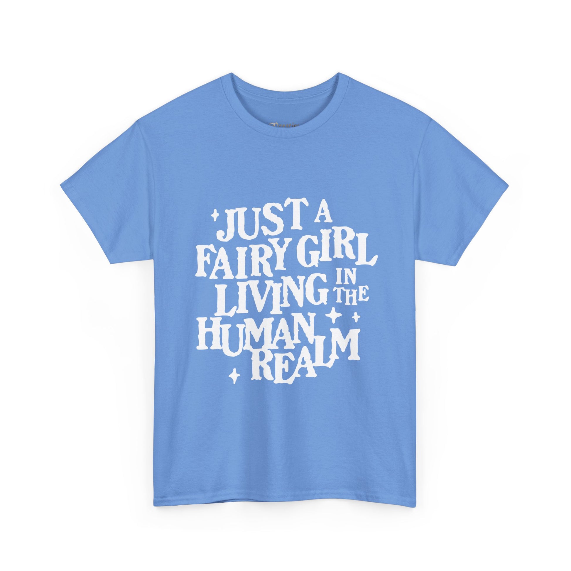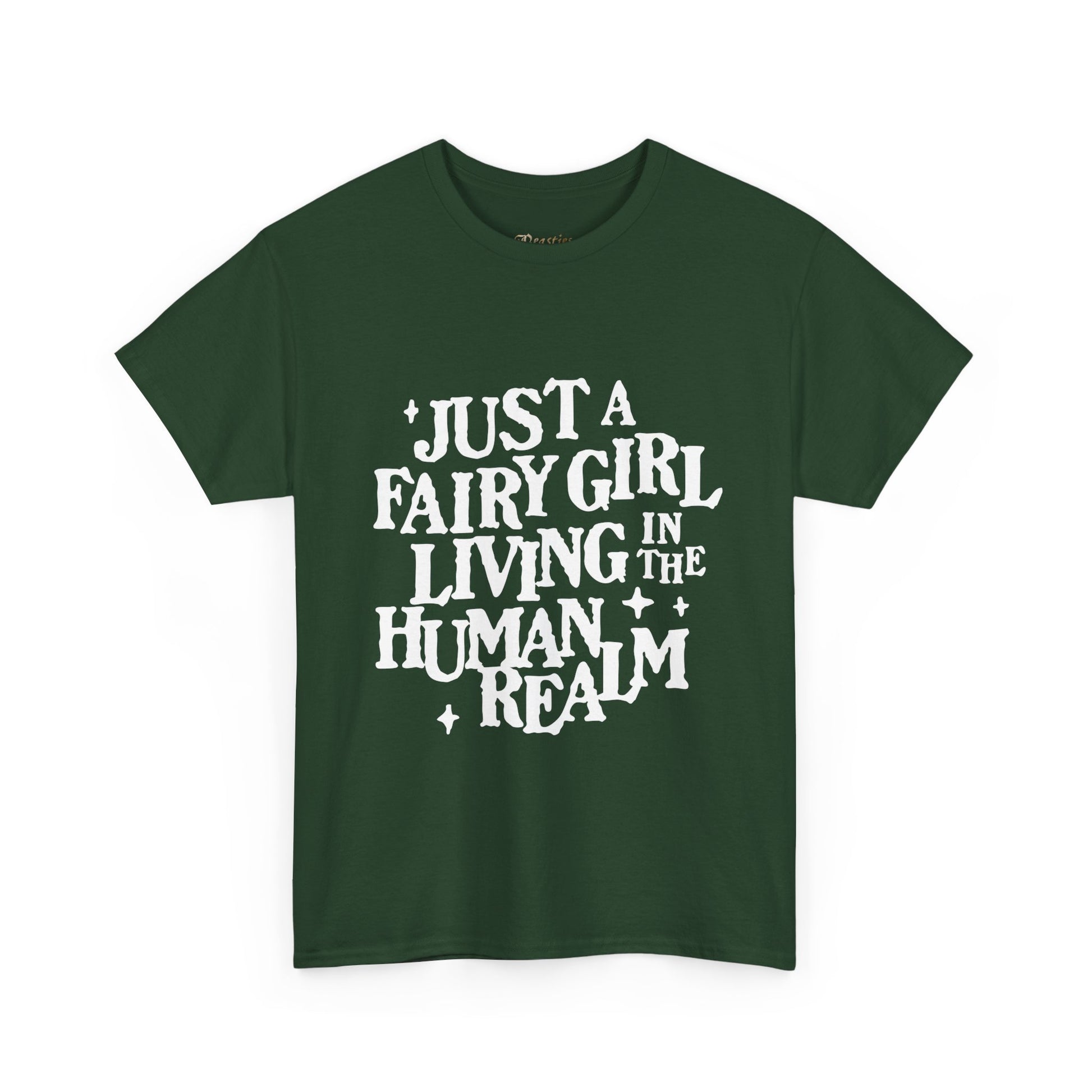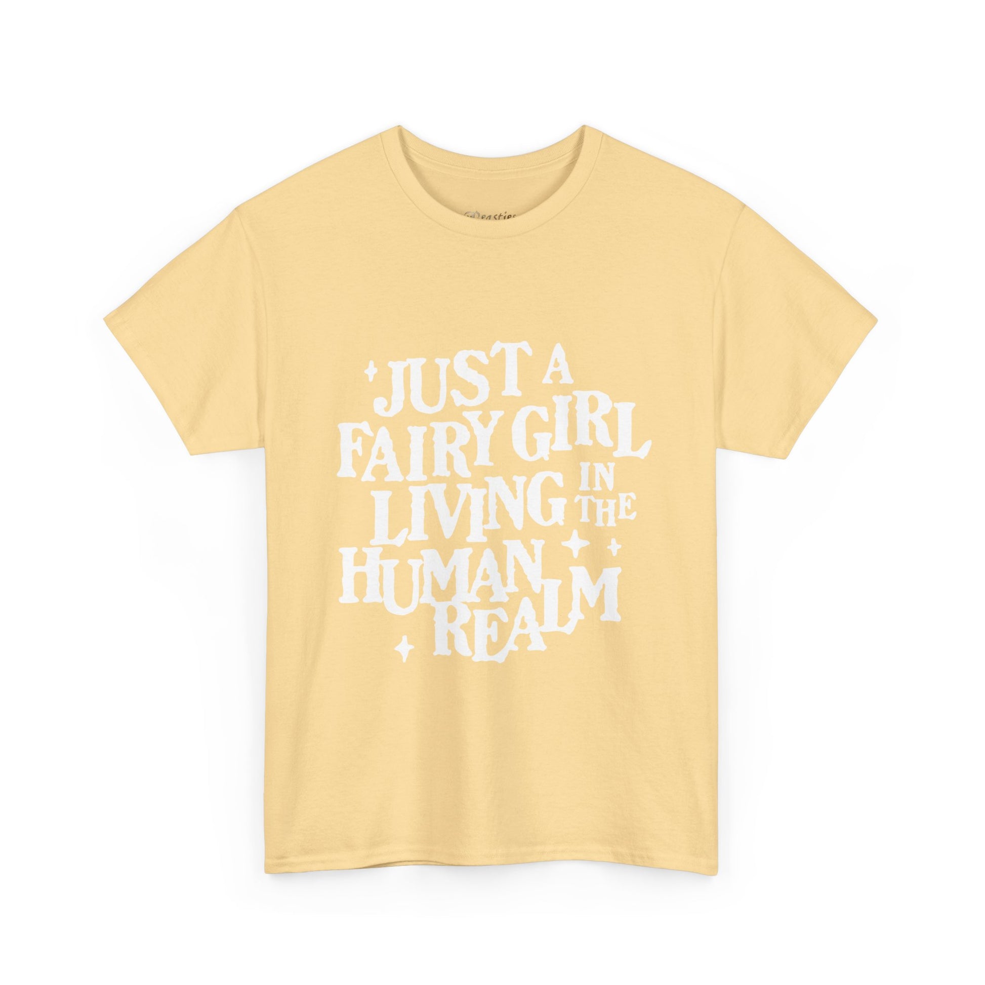 Soft, worn-in black cotton with a hand-lettered declaration: “Just a fairy girl living in the human realm.” This tee reads like a quiet spell — whimsical but grounded. It’s for evenings under string lights, for coffee shop corners where you sketch small worlds, and for strolls that end at hidden gardens. The slightly chunky, vintage-inspired type and tiny star accents feel like a secret shared between kindred spirits. Wear it with layered necklaces, an oversized cardigan, or your favorite boots; it settles into your wardrobe and your mood, not shouting but inviting a knowing smile.
