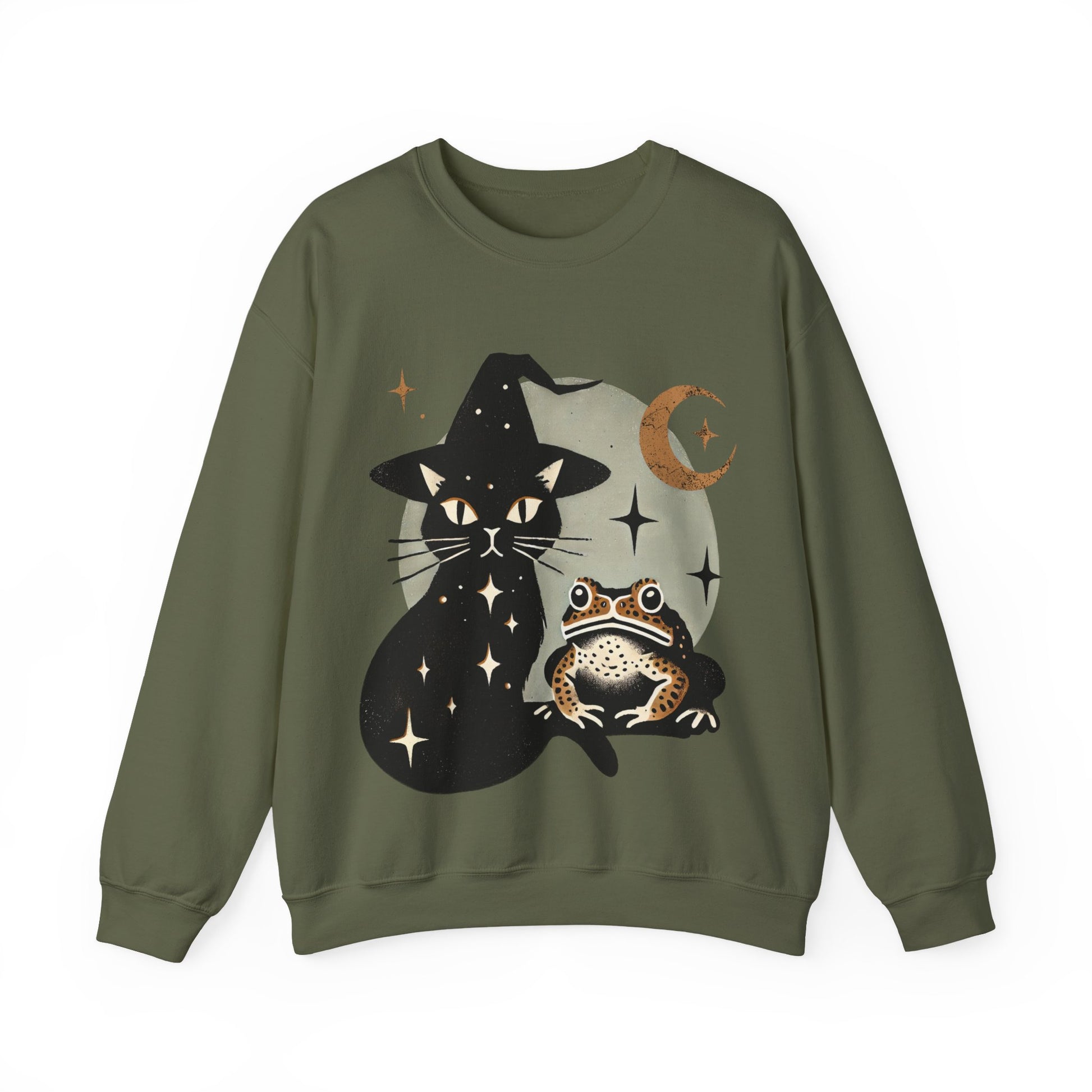 Witchy sweatshirt, familiar friends, black cat sweatshirt, toad sweatshirt, crescent moon shirt, antique block print, mystical apparel, gothic clothing, fleece lined sweatshirt, cozy witch wear, earthy tones, unique gift,