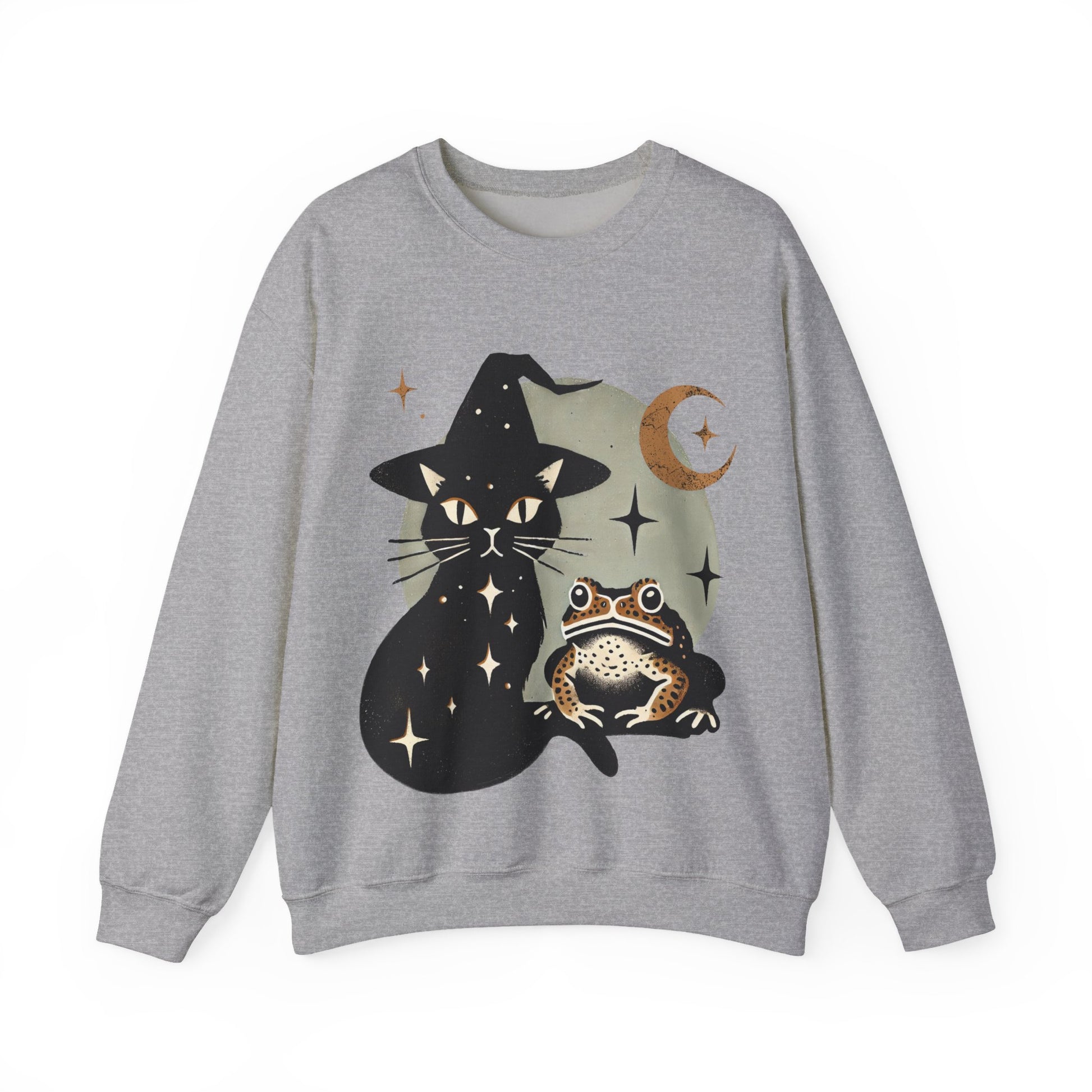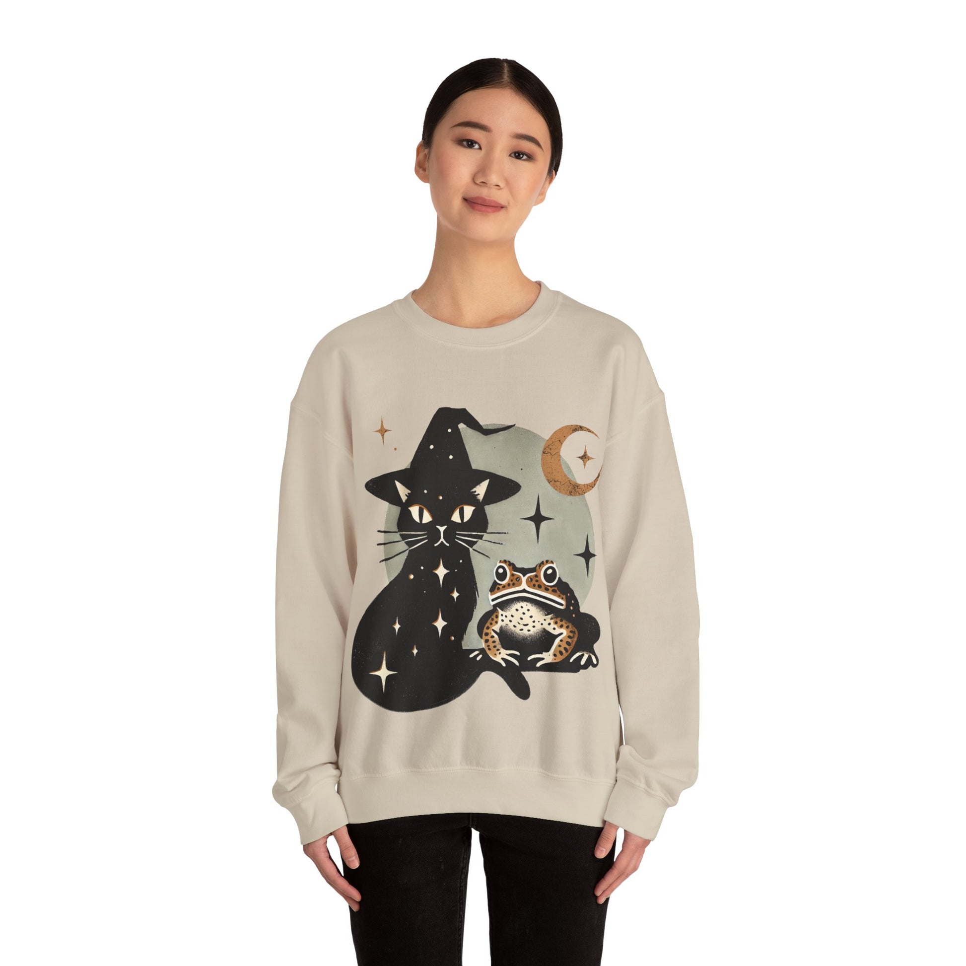 Embrace your inner witch with our "Familiar Friends" sweatshirt, a must-have for lovers of all things mystical and magical. This unique design features two classic witchy familiars – a sleek black cat and a wise toad – set against a enchanting crescent moon, all rendered in a striking antique block print style.