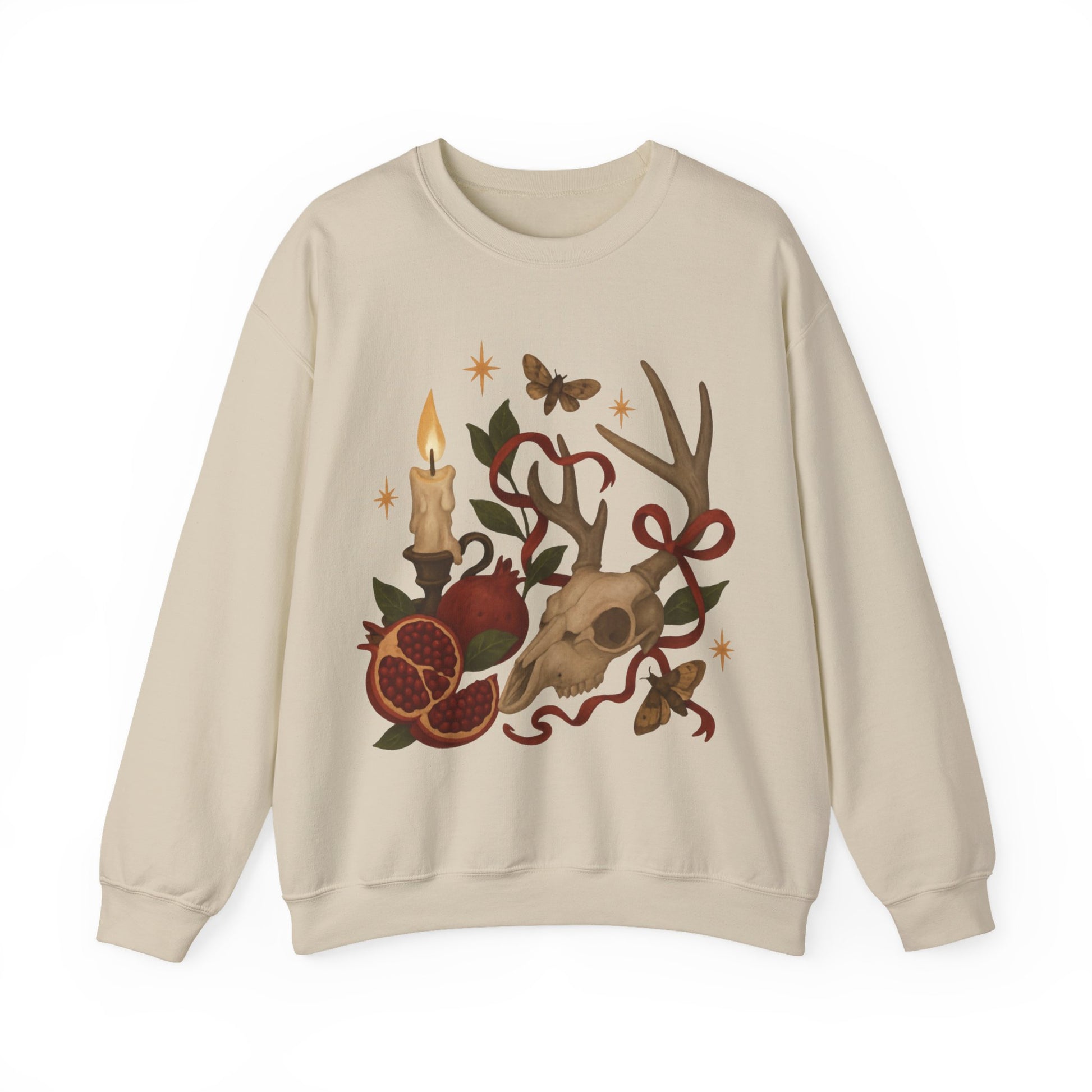 Dare to dream of a darker, more enchanting holiday with our "Hexmas Eve" crewneck. This captivating design is a celebration of gothic Yuletide and dark winter magic, perfect for those who find beauty in the shadows. Featuring a striking deer skull adorned with a crimson ribbon, surrounded by luscious pomegranates – ancient symbols of fertility and the underworld – and a flickering yule candle, this piece evokes a sense of antique mystery. Moths, symbols of transformation, flutter around shimmering stars, adding to the mystical ambiance.