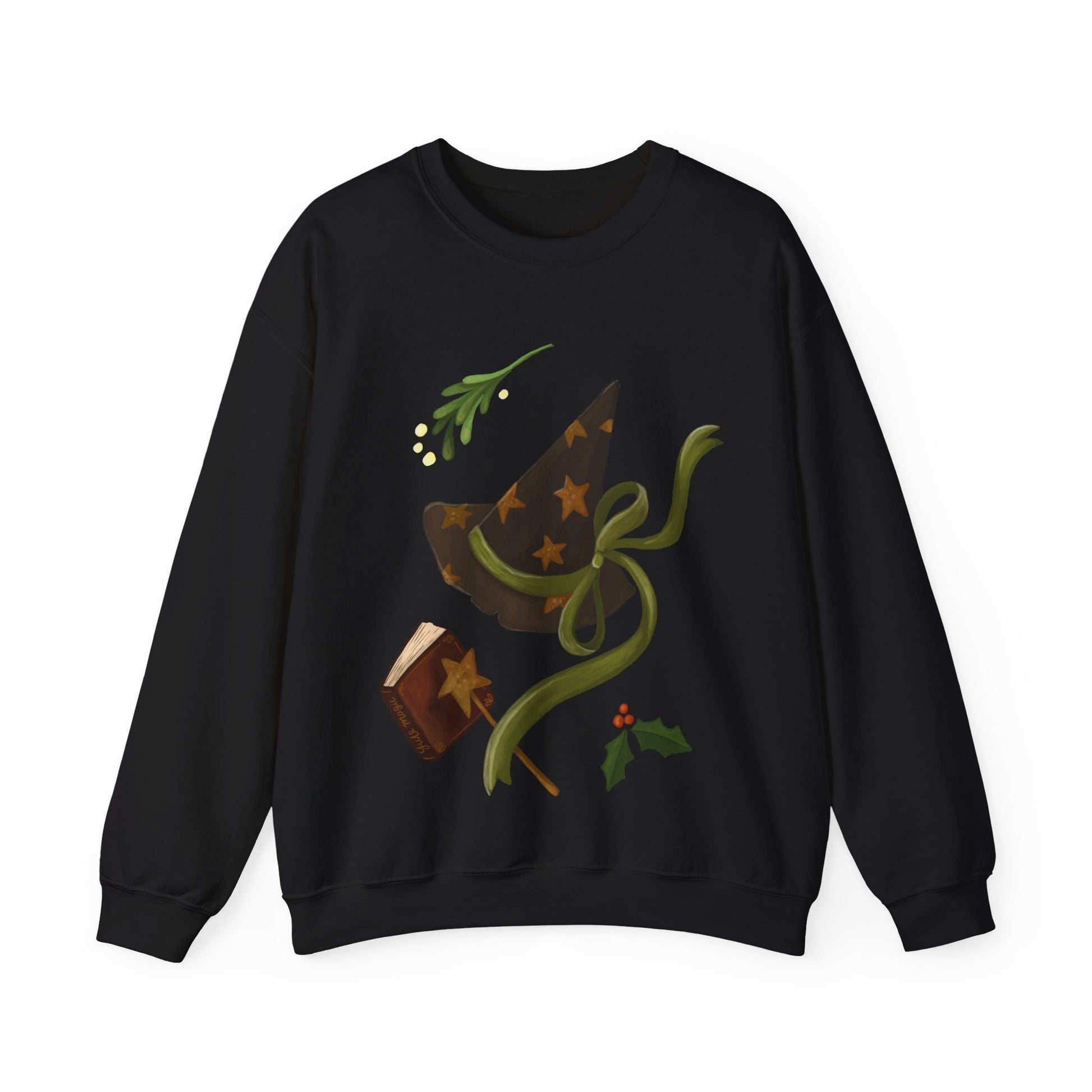Celebrate a truly magical Christmas with our "Witchmas" crewneck! This beautifully detailed design captures the cozy, mystical side of the holidays, perfect for any bookish witch or magical aesthetic lover. The centerpiece is a festive witches hat, adorned with golden stars and wrapped in a flowing emerald green ribbon, floating above a mystical spell book. Sprigs of holly and mistletoe complete the enchanting scene. For the Elpheba of the family this Christmas.