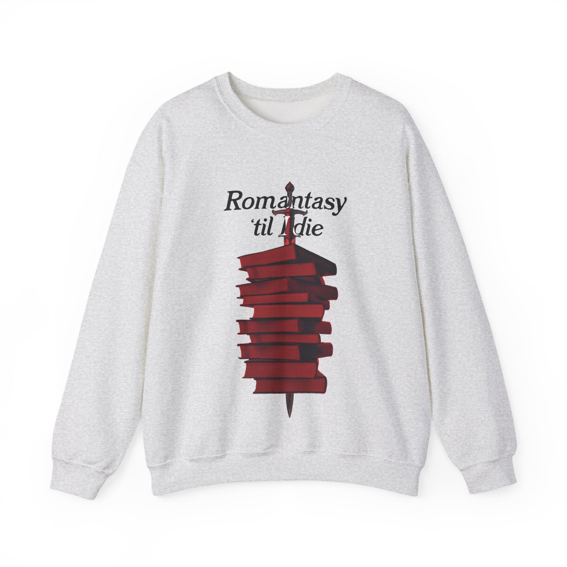 Soft, warm, and quietly bold — this crewneck wraps you in a comfy weight while saying exactly who you are. A stacked pile of deep-red books pierced by a slender dagger sits at the chest beneath the words “Romantasy ’til I die,” a design made for readers who love dark plots, slow-burn passion, and stories that linger. Wear it on long reading nights, at book club meetings, or while hunting for that next page-turner. The fabric has a lived-in feel without ever looking sloppy, and the clean crew neckline keeps the silhouette classic so the artwork stays the focal point. Ethical cotton sourcing and durable double-needle stitching mean this sweatshirt will travel with you through seasons of reading and rewrites.