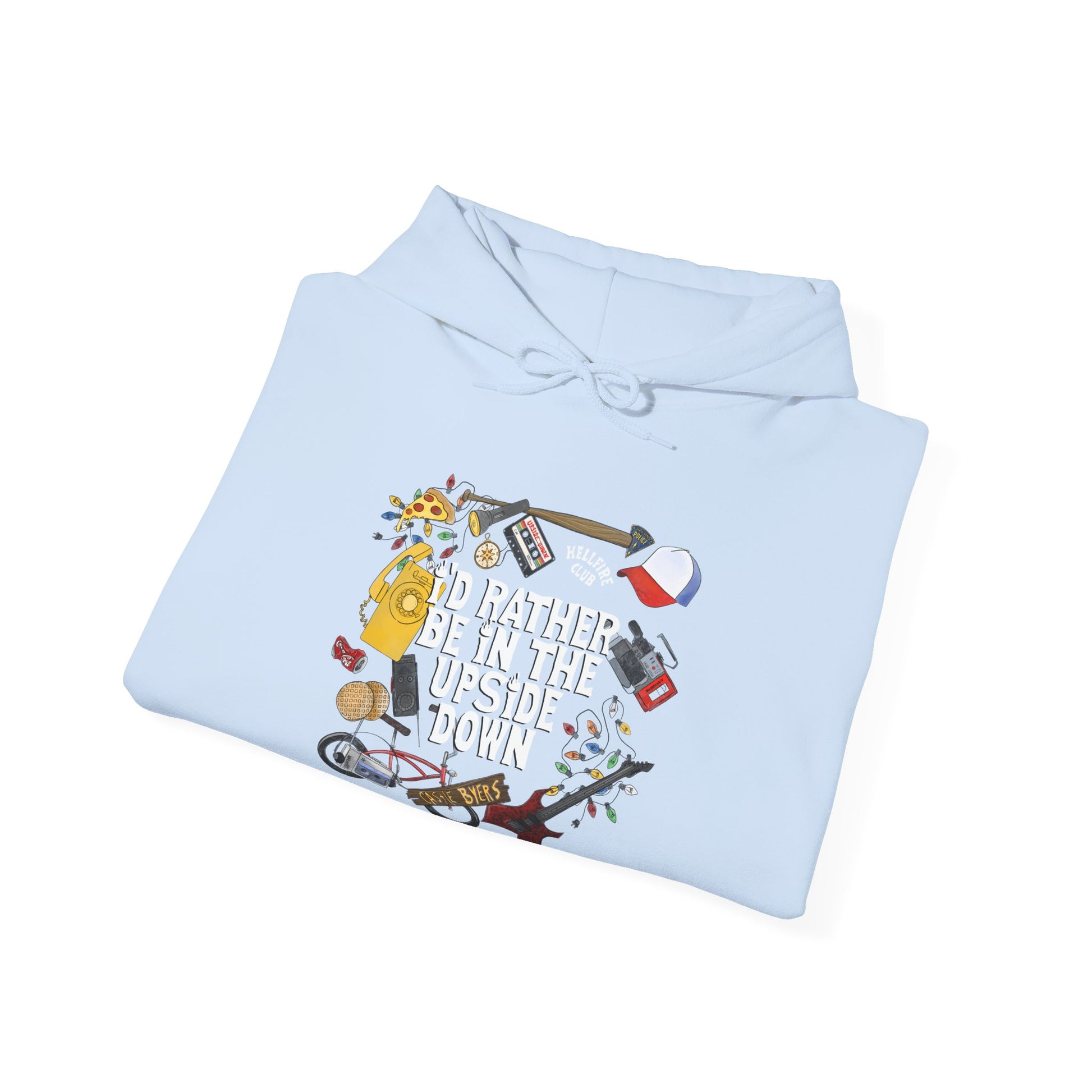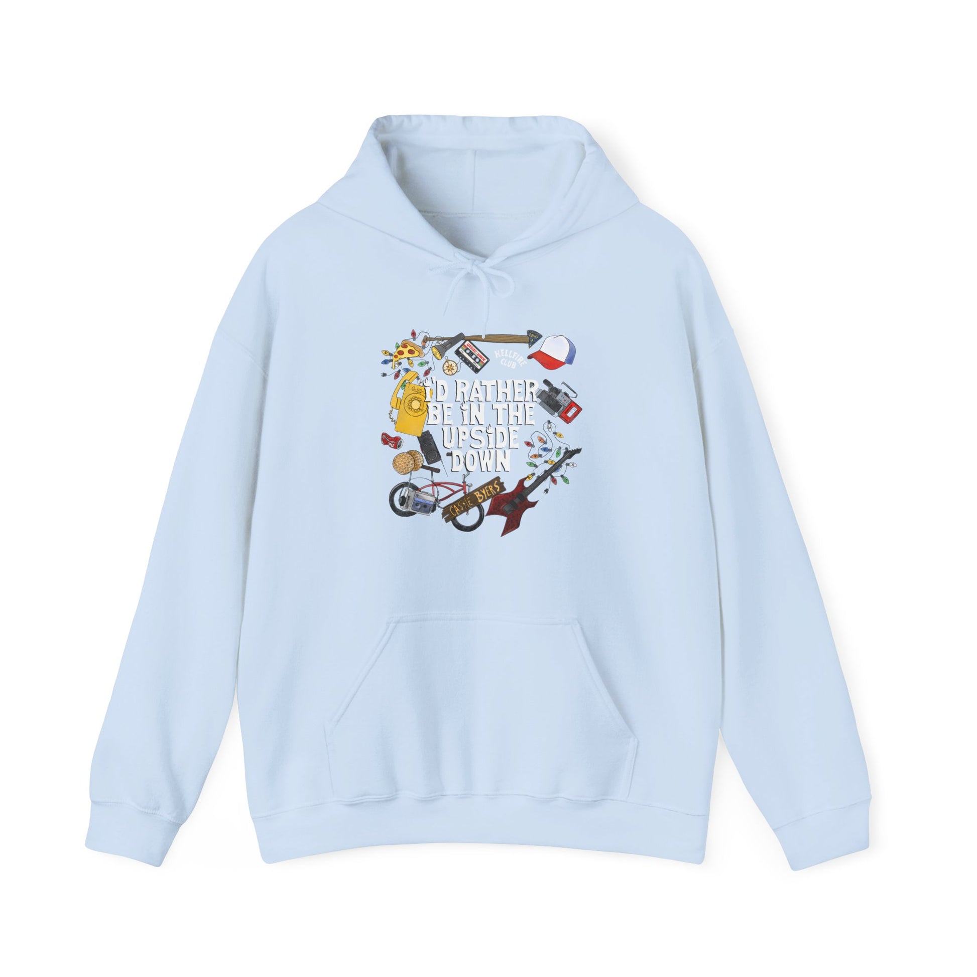 Keywords: Stranger Things sweatshirt, doodle art, hand-drawn design, Hawkins Indiana, Eleven waffles, Demogorgon,Steve's bat, Christmas lights, Upside Down, fan merchandise, unisex apparel, TV show clothing, nostalgic fashion,geek chic, pop culture, comfortable sweatshirt.