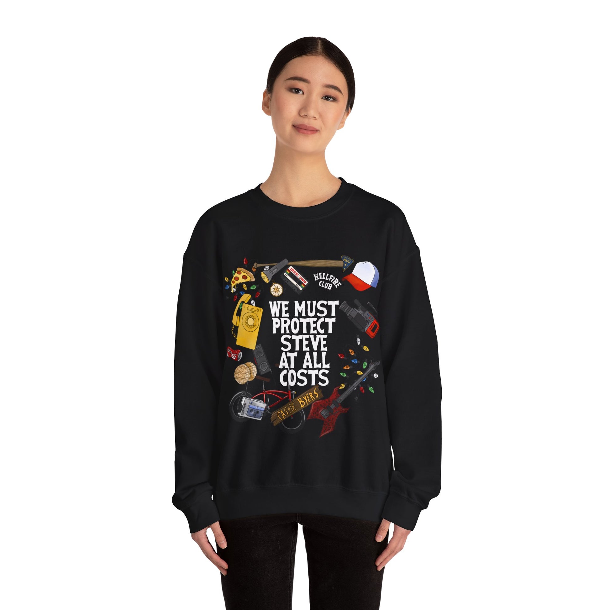 Keywords: Stranger Things sweatshirt, doodle art, hand-drawn design, Hawkins Indiana, Eleven waffles, Demogorgon,Steve's bat, Christmas lights, Upside Down, fan merchandise, unisex apparel, TV show clothing, nostalgic fashion,geek chic, pop culture, comfortable sweatshirt.