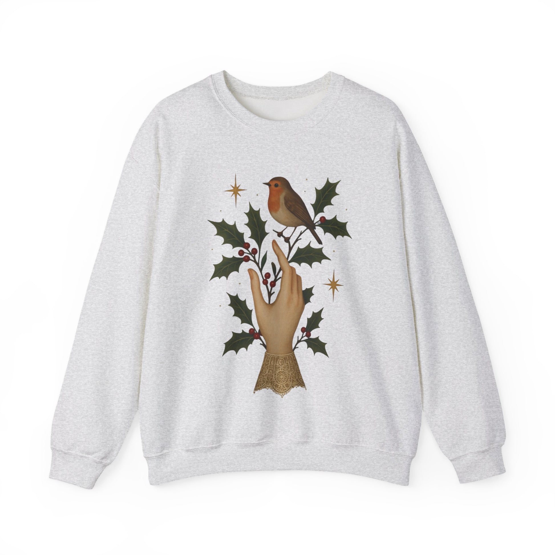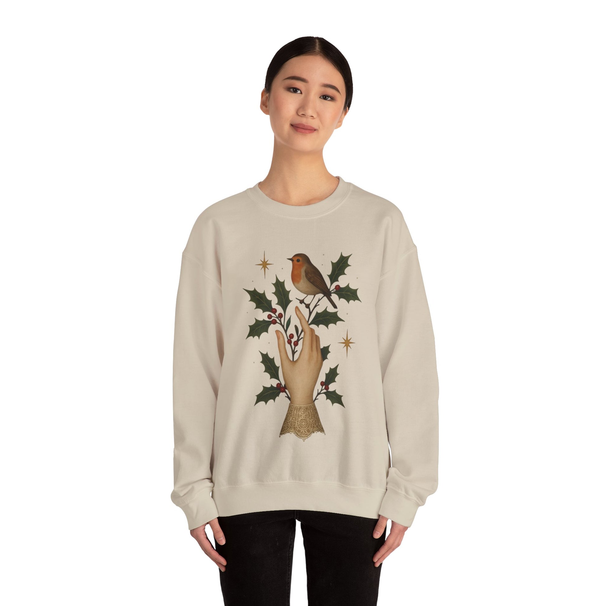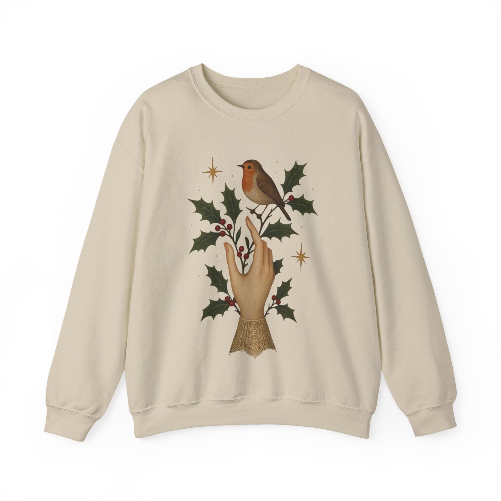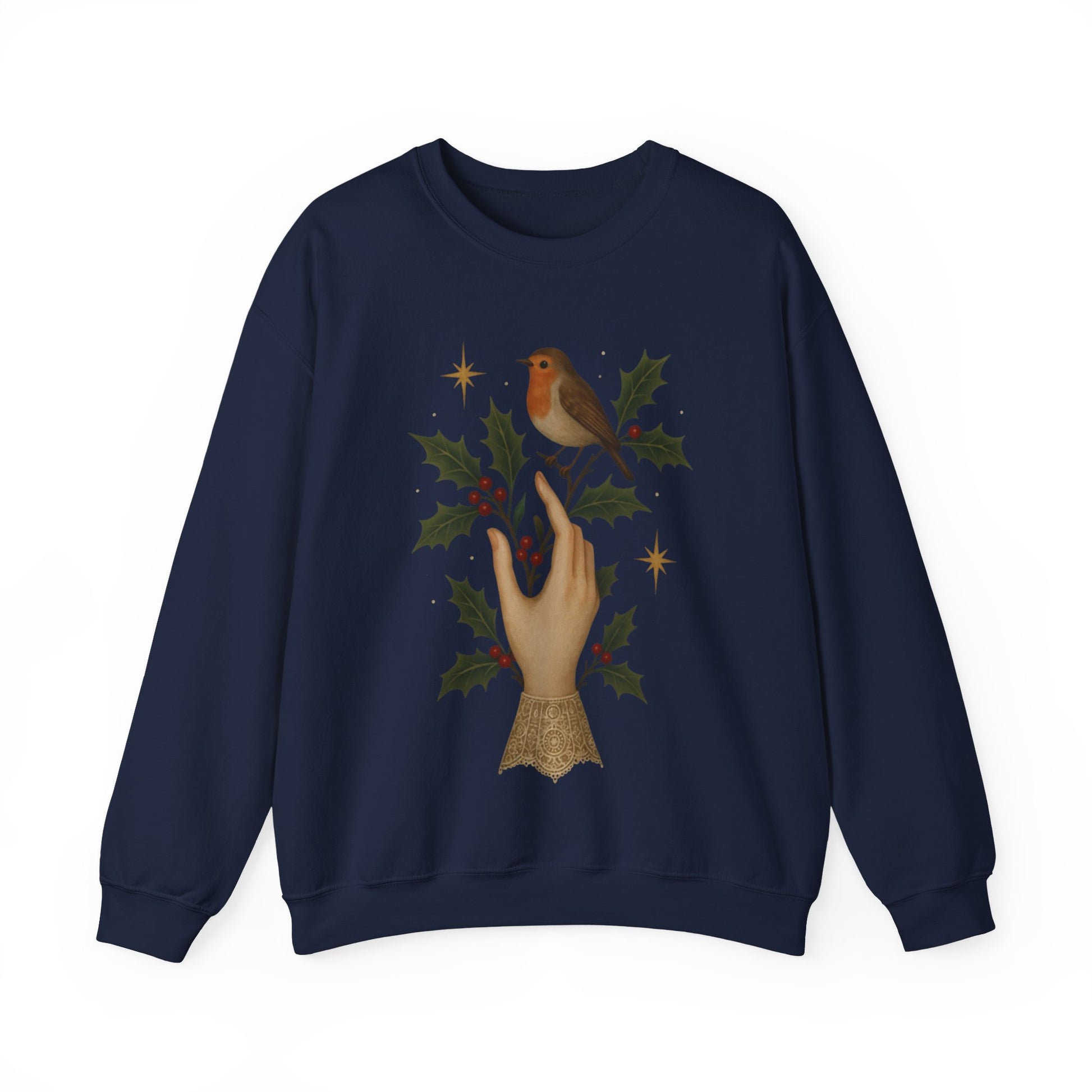 Embrace the serene magic of the season with our "Winter's Gentle Whisper" sweatshirt. 🌟 This enchanting design captures a moment of quiet grace, featuring an elegant, antique-inspired hand reaching delicately towards a branch of vibrant holly, upon which a charming robin perches, sharing a secret. Adorned with subtle golden stars, this piece evokes the warmth of tradition, the beauty of nature, and the gentle whispers of holiday wonder. Crafted for comfort and sprinkled with whimsy, it's a truly magical addition to your festive wardrobe, perfect for cozy contemplation or spreading quiet cheer.