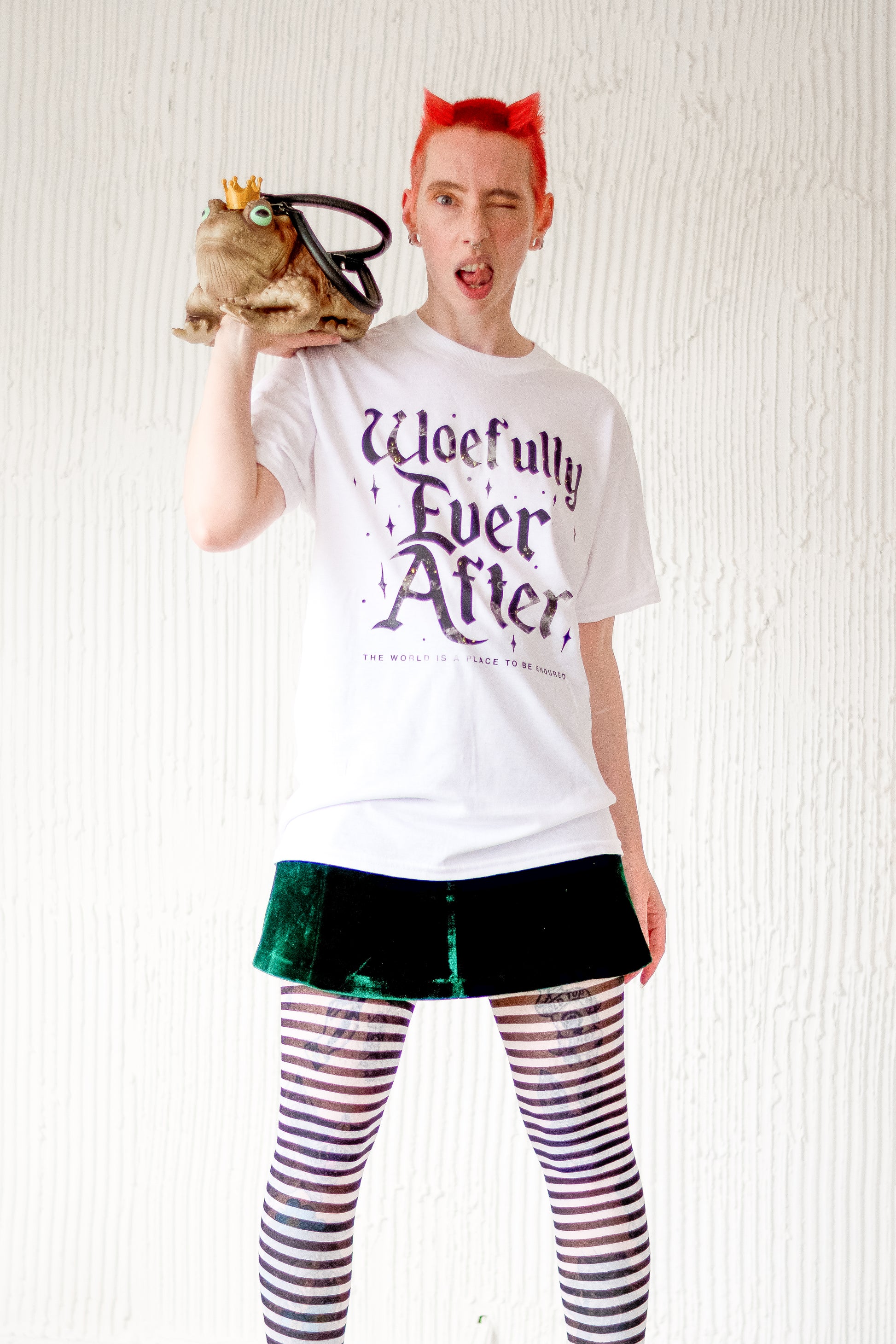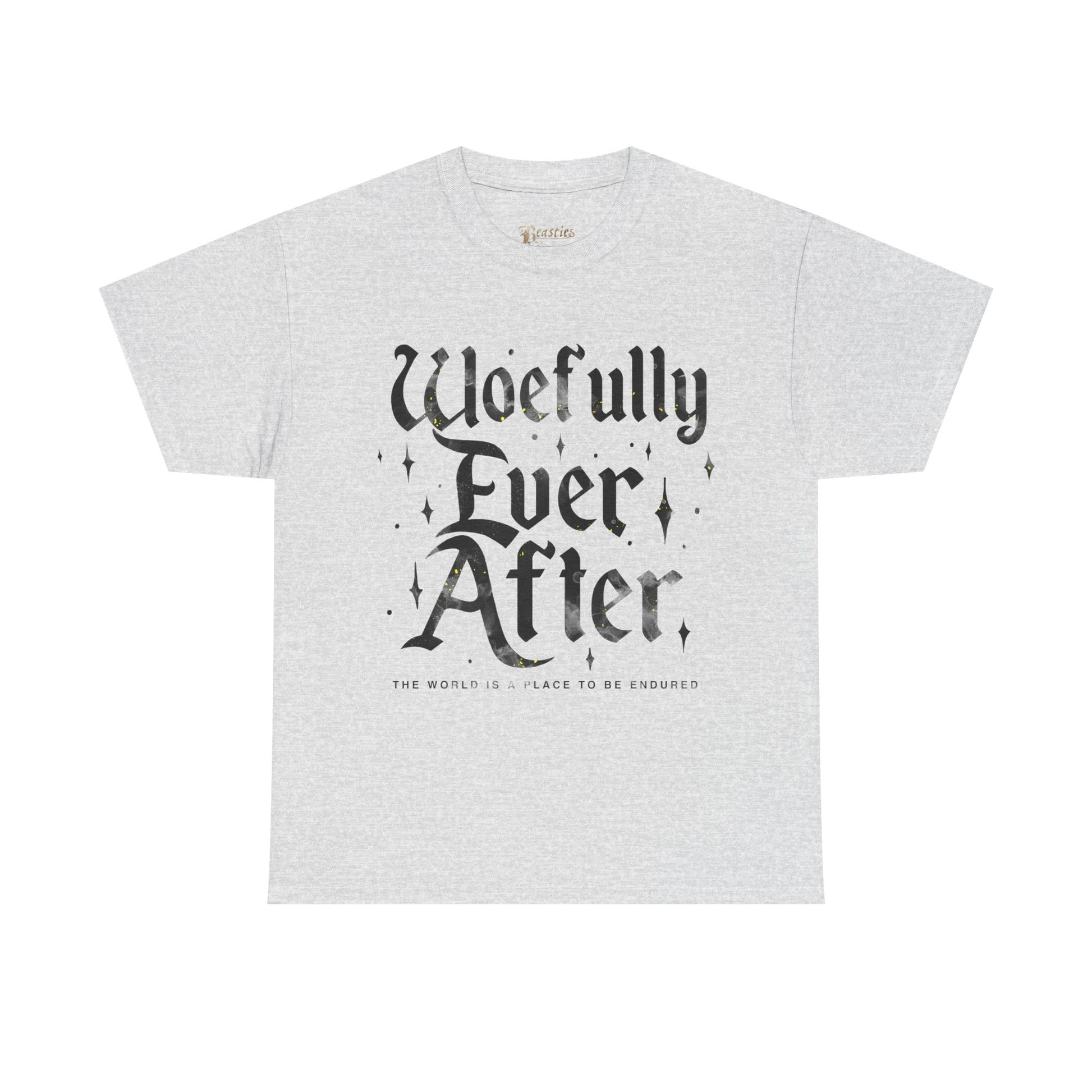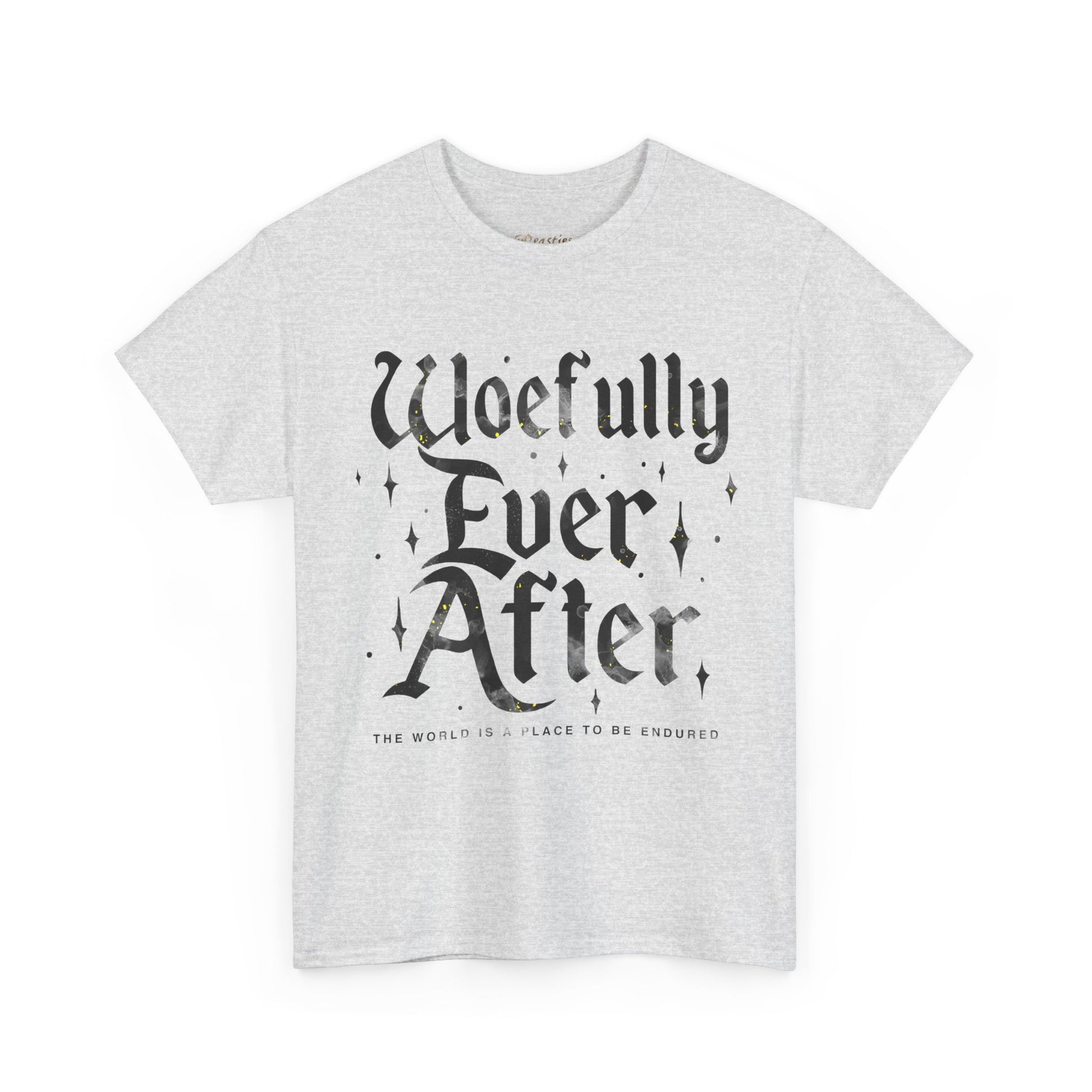 This tee speaks with a dry, playful wit — a white classic-fit shirt printed with gothic lettering that reads “Woefully Ever After.” It feels like a small, private joke you share with fellow fans of dark humor and melancholic romance. The soft, medium-weight cotton holds the crisp DTG print without losing shape, and the clean crew neckline keeps the look simple so the message stands out. Wear it while wandering bookshops, nursing a black coffee at the corner cafe, or layering under a leather jacket for low-key drama. Subtle sparkles in the design add a touch of whimsical irony, turning an everyday tee into a quietly expressive piece of wardrobe storytelling.